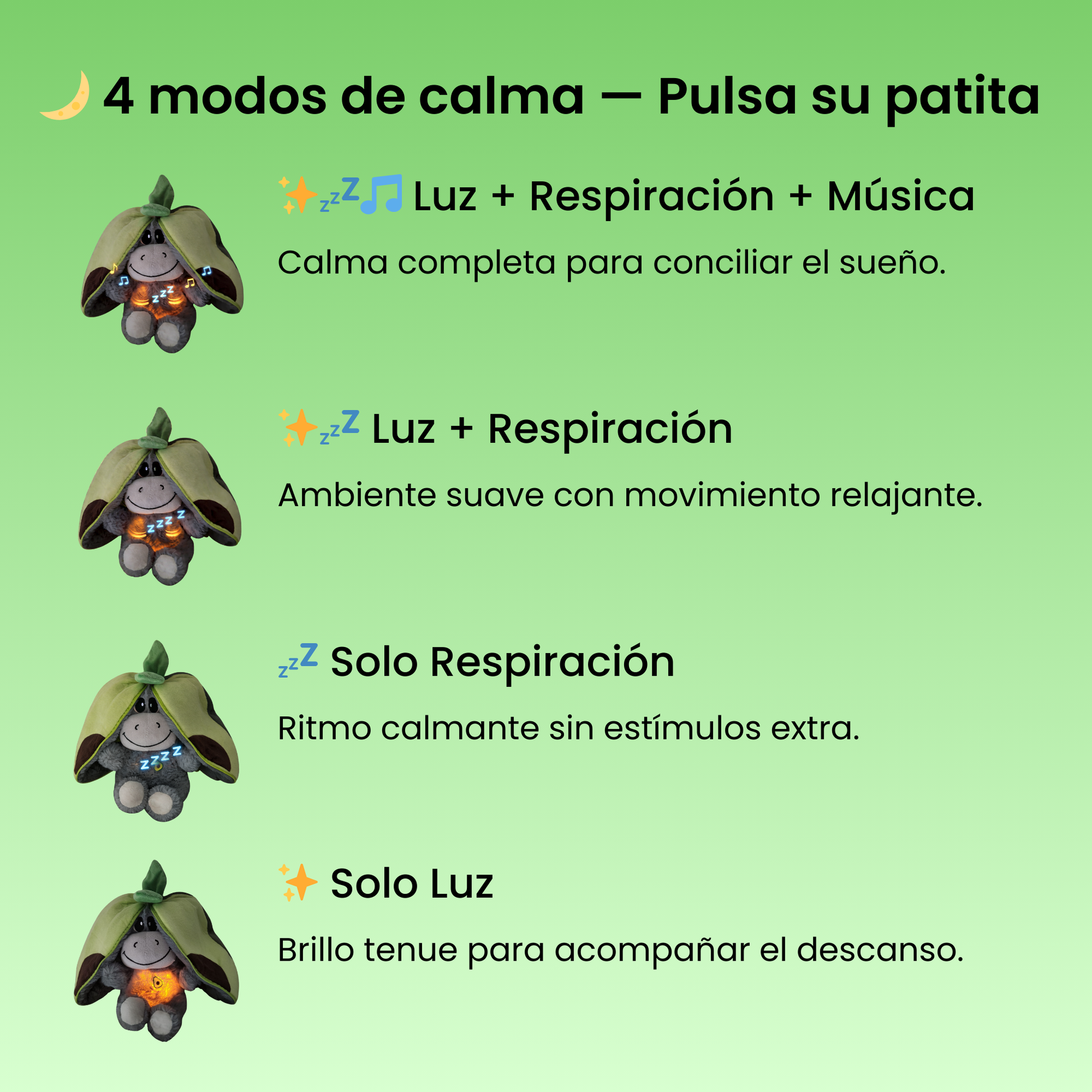 Cuenta con cuatro modos de funcionamiento. Para cambiar entre ellos, solo tienes que presionar suavemente su patita hasta encontrar el ritmo que prefieras para dormir.